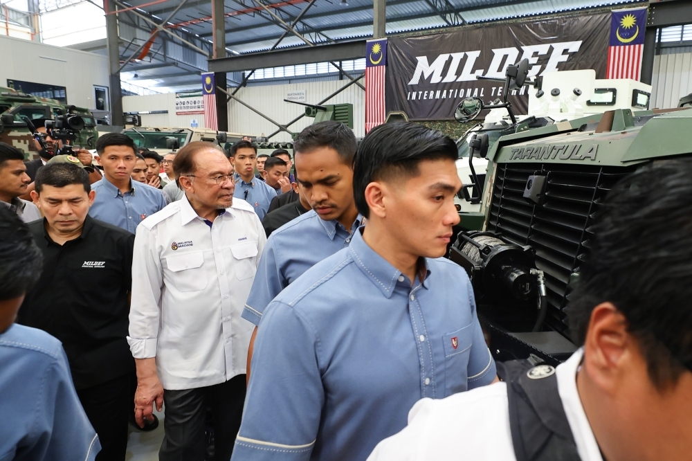 Prime Minister Datuk Seri Anwar Ibrahim looks at armoured vehicles during a visit after the inauguration of the National Armoured Vehicle Manufacturing Factory at Mildef Technologies Sdn Bhd (Mildef), Sendayan August 23, 2025. — Bernama pic