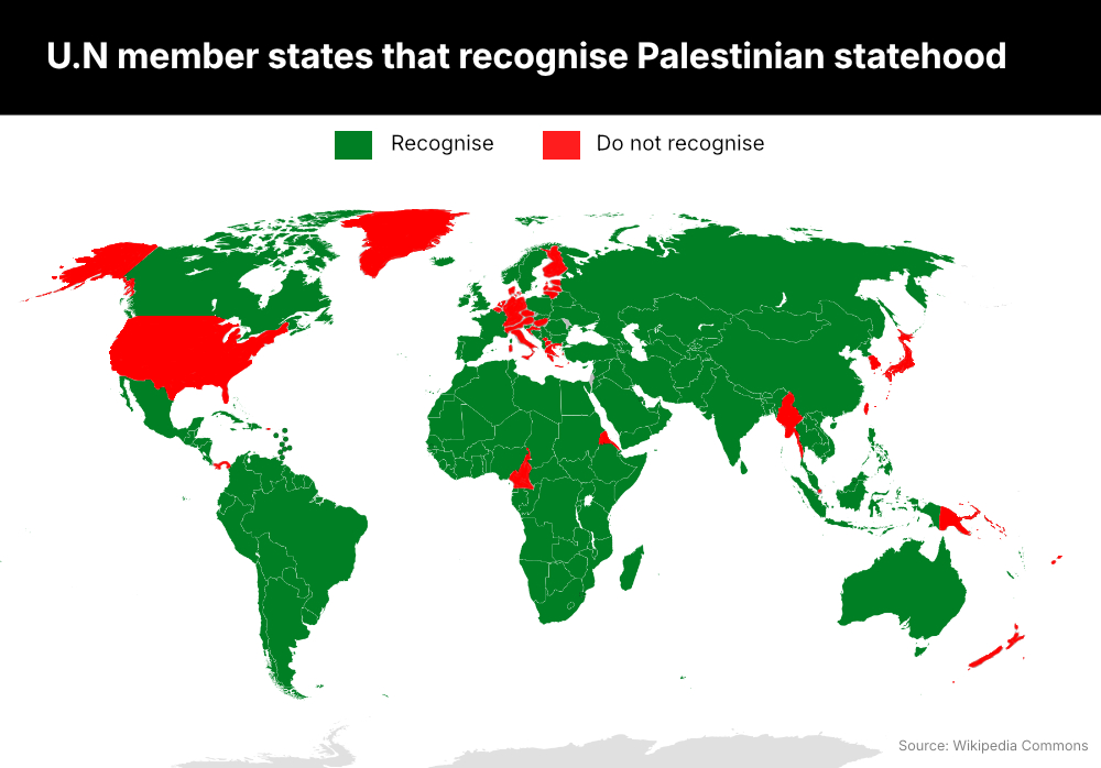 Today, more than 80 percent of the world’s countries - 157 out of 193 UN member states - recognise the state of Palestine. Some of the most recent additions to this growing list include Britain, France, Canada, and Australia.
