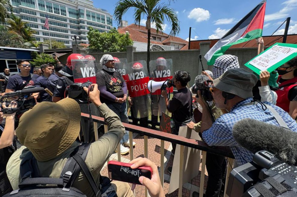 KUALA LUMPUR — Police have arrested two men for injuring an officer during a pro-Palestinian protest outside the United States Embassy today.