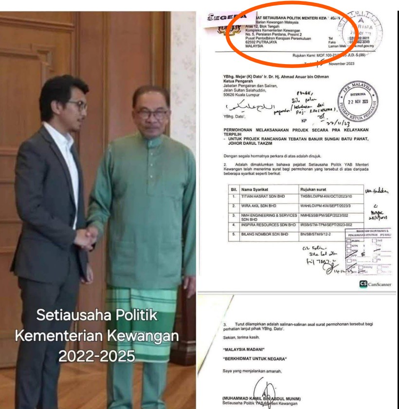 Muhammad Kamil Abdul Munim who is the political secretary (polsec) of the Finance Minister (who also happens to be PMX) is alleged to have issued a support letter bearing the letter head of “Office of the Finance Minister’s Political Secretary” to the Department of Irrigation and Drainage’s (JPS) director-general with a list of five pre-qualified private companies “applying” for the Batu Pahat flood mitigation project.