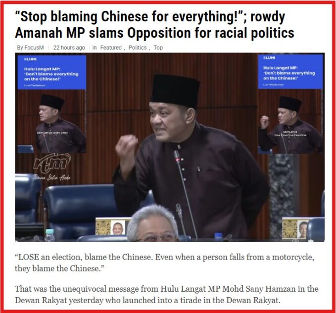 Mohamad’s stringent criticism was picked up by Hulu Langat MP Mohd Sany Hamzan who berated those people – presumably the Malays – for their tendency of blaming the Chinese for everything, even “falling from a motorcycle”.