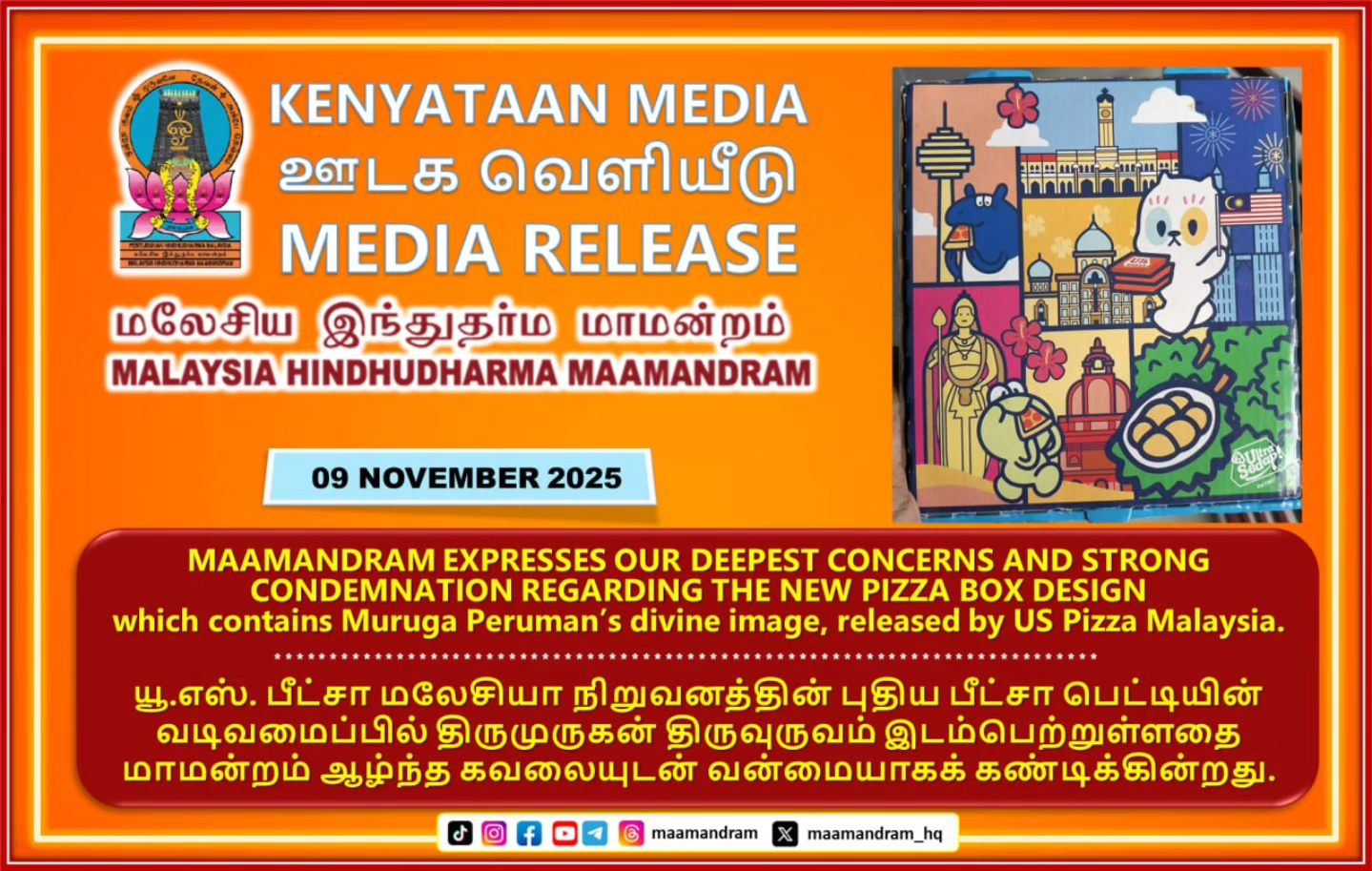 Malaysia Hindhudharma Maamandram, a prominent Hindu organisation, expressed its deep concerns and strong condemnation over a recent packaging design by US Pizza Malaysia. - Social media pic, November 9, 2025