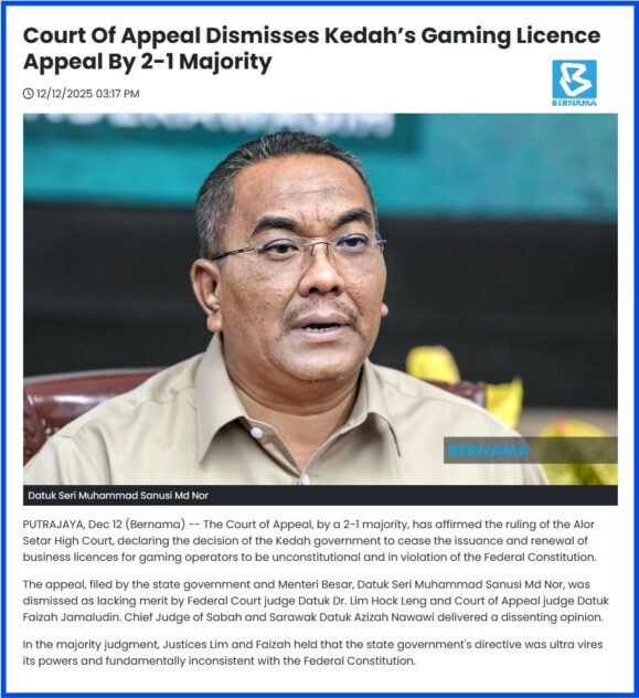 This follows Friday’s (Dec 12) 2-1 majority Court of Appeal verdict to uphold the Alor Star High Court ruling which declared the Kedah state government’s decision to cease the issuance and renewal of business licences for gaming operators as unconstitutional and in violation of the Federal Constitution.