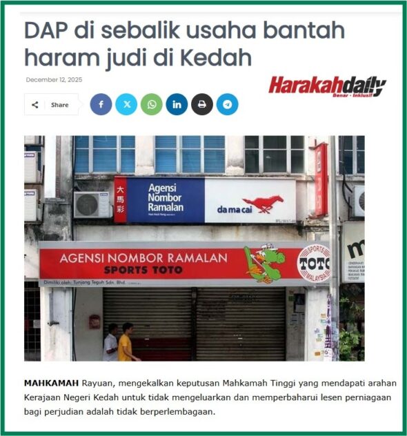 1. Di saat DAP sibuk menekan Kerajaan Madani dengan pelbagai tuntutan yang semakin tidak masuk akal, parti itu menerima satu “kemenangan besar” apabila usaha mereka mencabar keputusan Kerajaan Negeri Kedah mengharamkan kedai judi akhirnya berjaya di Mahkamah Rayuan.