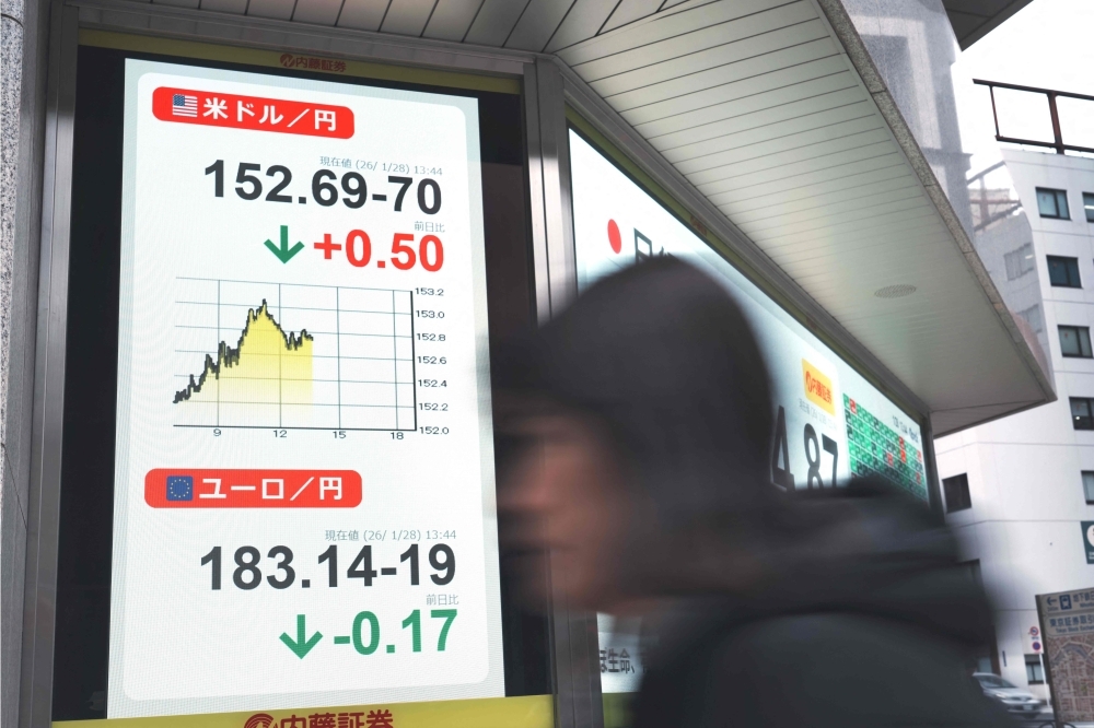 Foreign exchange rates for the yen and US dollar are displayed along the sidewalk in downtown Tokyo on January 28, 2026, amid renewed market jitters over Japan’s fiscal policy ahead of a snap election. — AFP pic