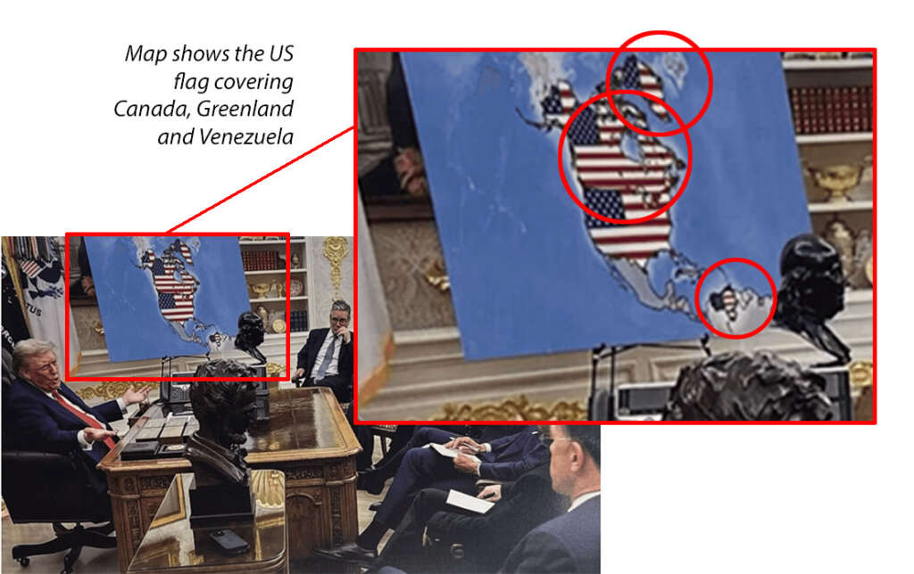 The newspaper features a composite photo (above) lately posted by President Trump, himself, on his social media platform, Truth Social. The report explains how this (enhanced) image combines:A photo taken in August, 2025, when European leaders visited the White House to discuss a Ukraine-Russia ceasefire; withA remarkable, superimposed, background display map showing American flags drawn over Greenland, Canada and Venezuela.