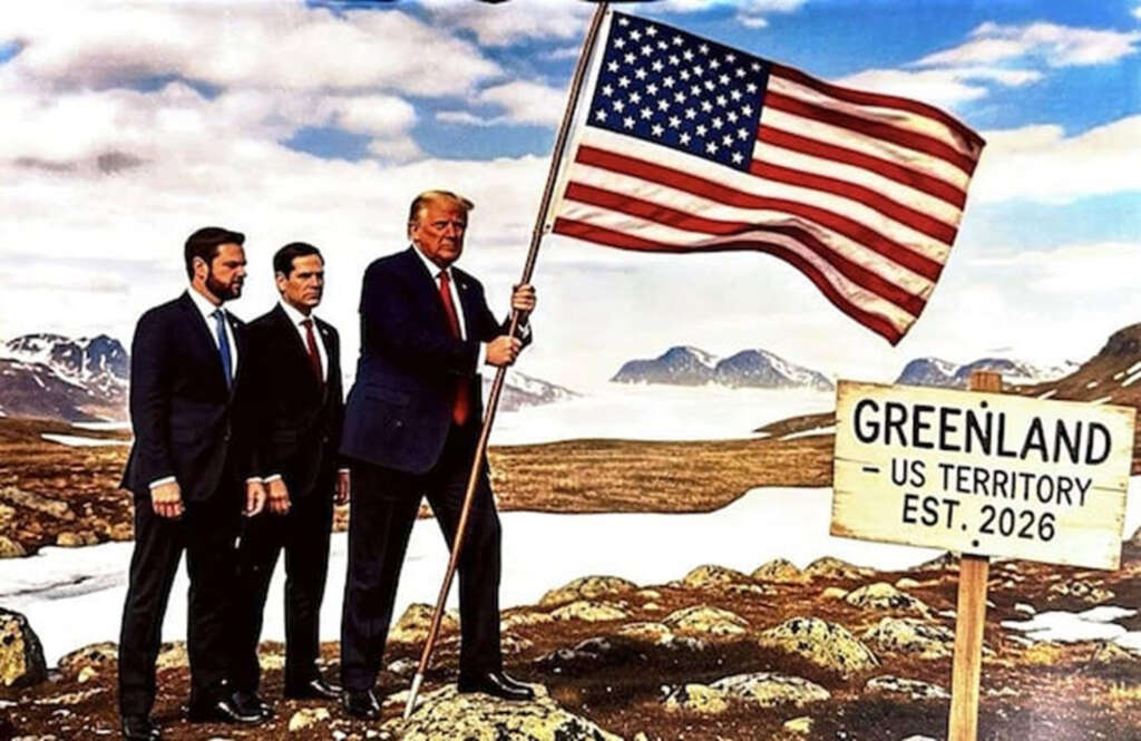 Soon after posting the first augmented photo, the president shared “another composite photo of himself [accompanied by J D Vance and Marco Rubio] holding a massive American flag on Greenland soil with a sign reading, ‘Greenland, U.S. Territory from 2026’.” (Below.)